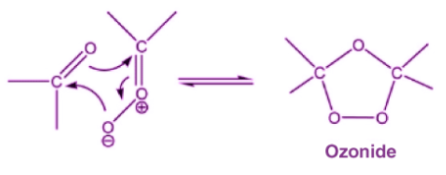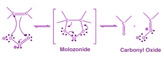 步驟1: 臭氧向碳-碳鍵的親電子加成形成了非常不穩(wěn)定的莫洛宗尼德中間體。 由于這種不穩(wěn)定的性質(zhì),莫洛宗尼德繼續(xù)反應(yīng)-分解形成羰基分子和羰基氧化物分子,如下所示: