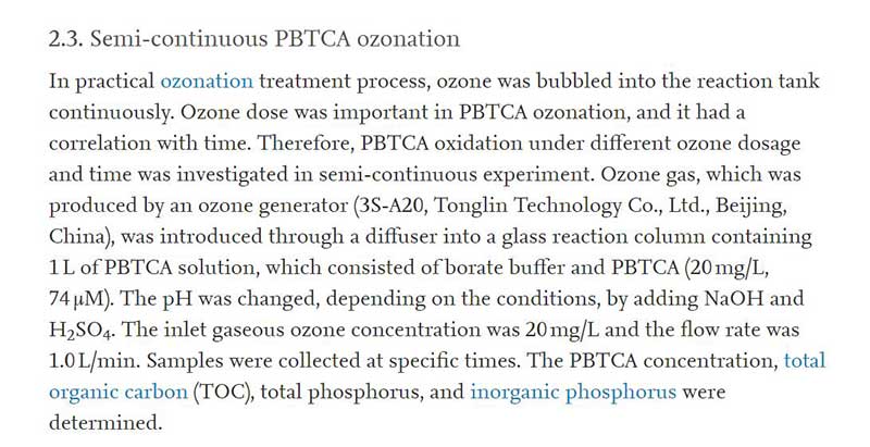 清華大學(xué)環(huán)境系使用同林臭氧發(fā)生器進(jìn)行水處理實(shí)驗(yàn),撰寫了關(guān)于臭氧化降解2-膦酰丁烷-1,2,4-三羧酸(PBTCA):動力學(xué),磷轉(zhuǎn)化,抗沉淀性能變化和除磷的論文。